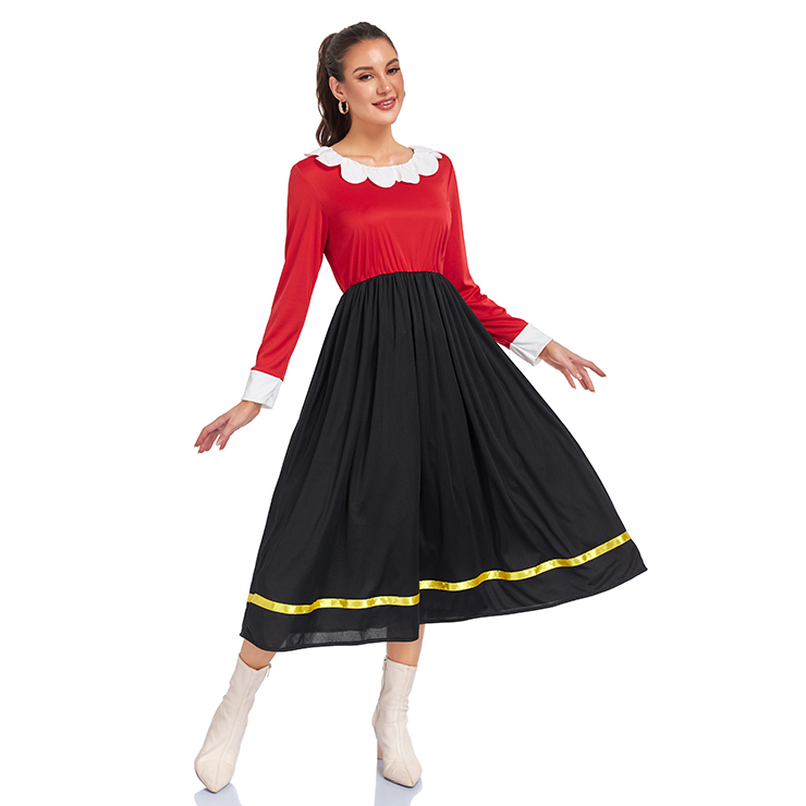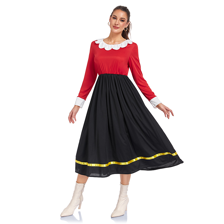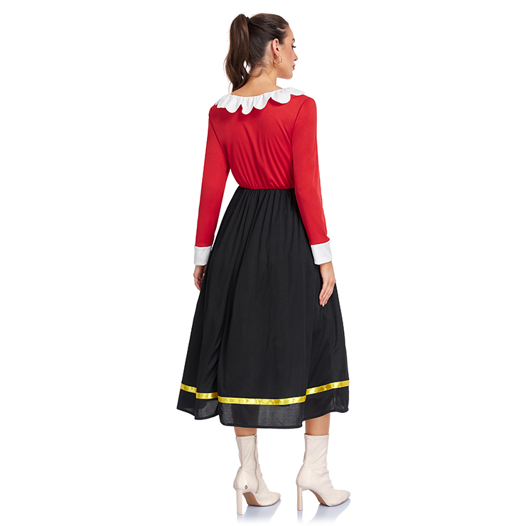 This retro-inspired sailor dress combines bold red and black for a playful 90s look. Featuring a classic white ruffle collar and cuffs, paired with a flowing black skirt edged with a subtle gold ribbon trim. Perfect for adding a touch of vintage charm to parties, holidays, or everyday style.