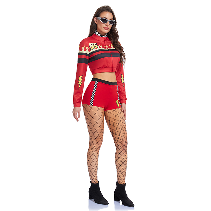 This bold red race girl costume set includes five key pieces: a cropped jacket with lightning and flame prints, a red inner top, matching shorts with checkered side stripes, a checkered neck scarf, and sleek sunglasses. Paired with fishnet stockings and ankle boots, the set creates a vibrant, high-energy look perfect for racing events, cosplay, or themed parties.