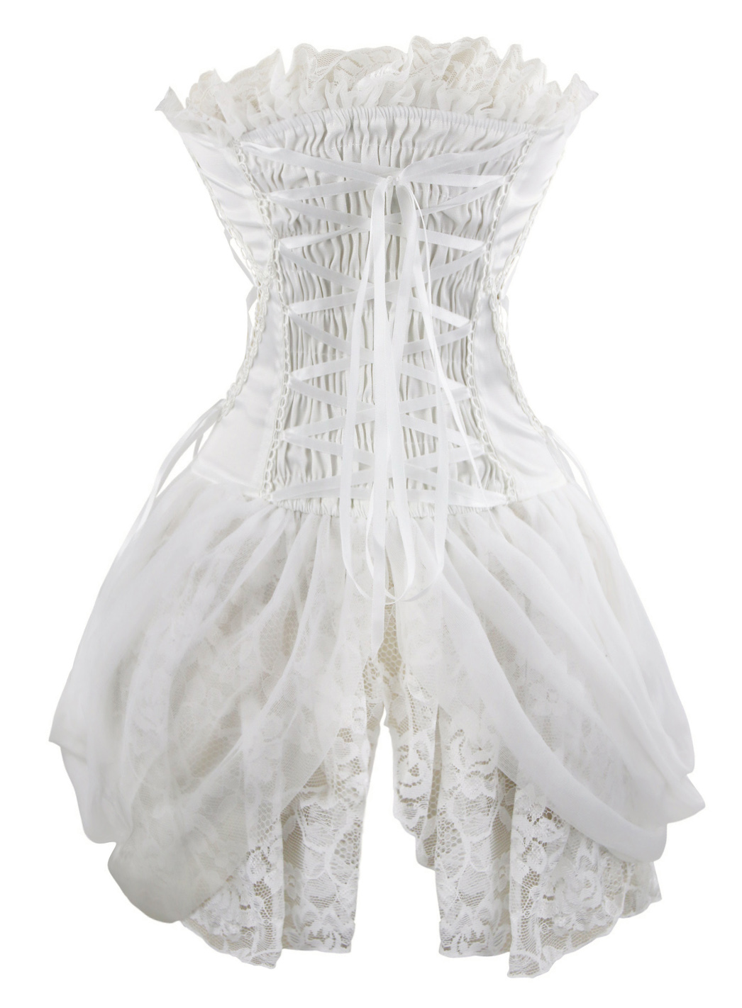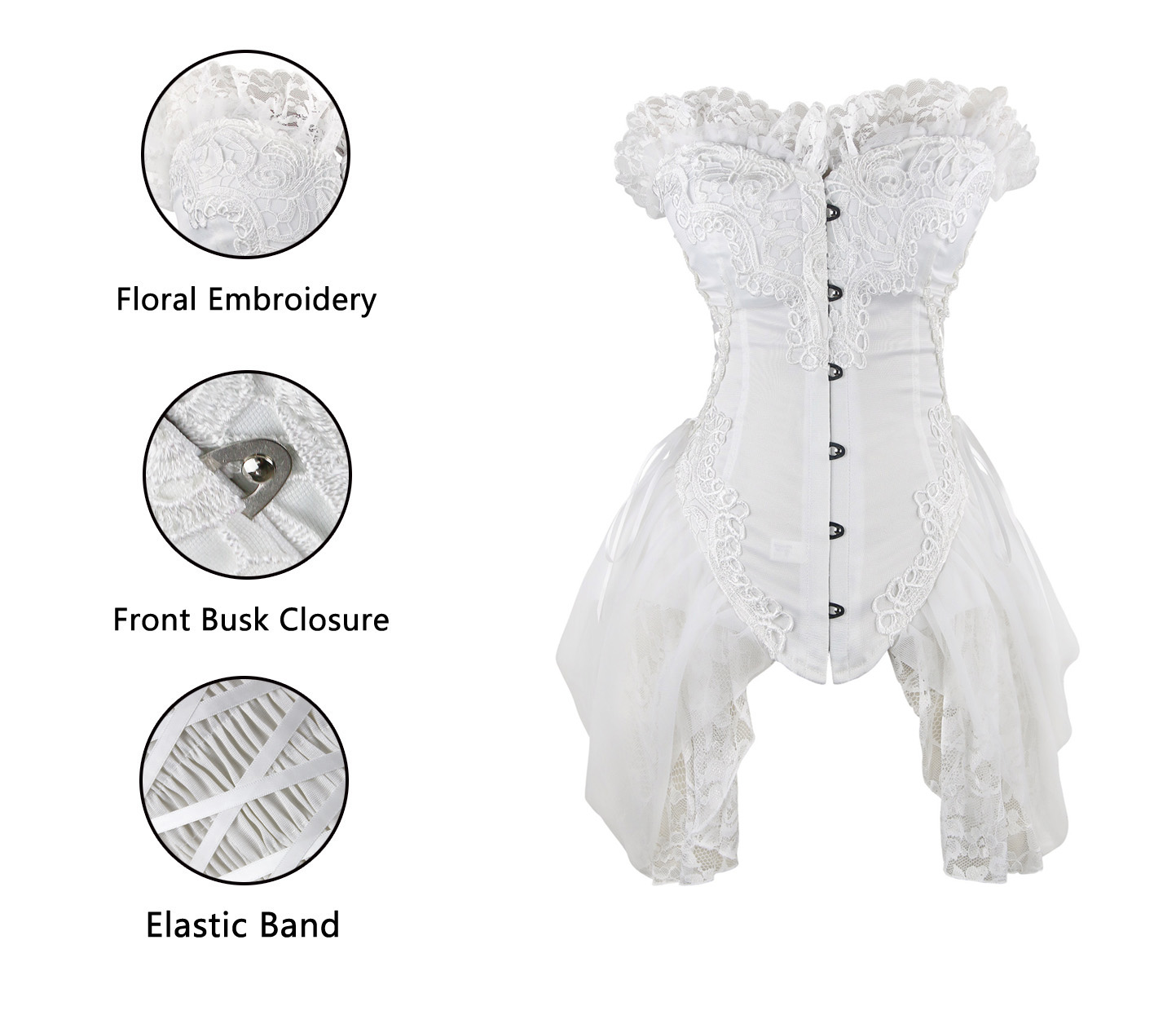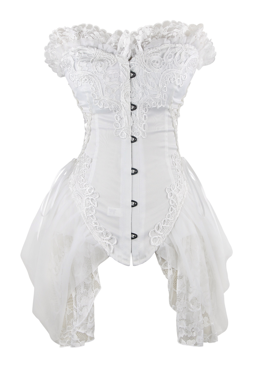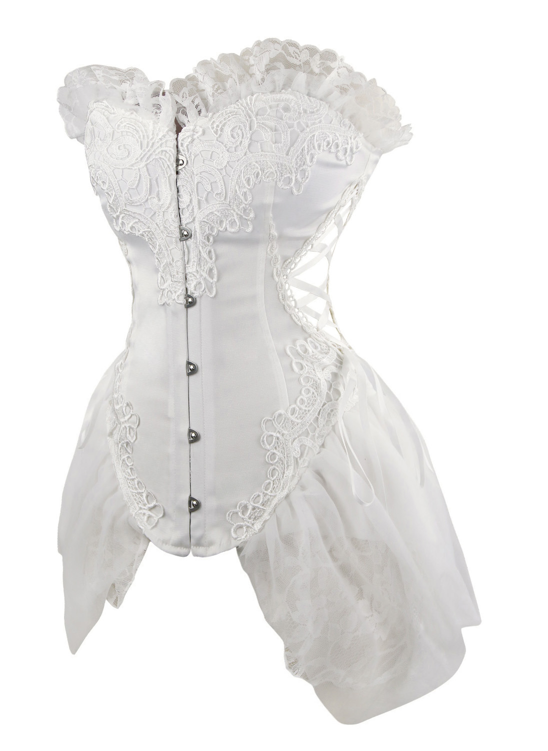 1 Piece Suit, Burlesque White Bustier Corset Made From Luxurious Material With Lace Trimmed, Side and back lace up. Front Buckle Closure, and attached lace side detail.
