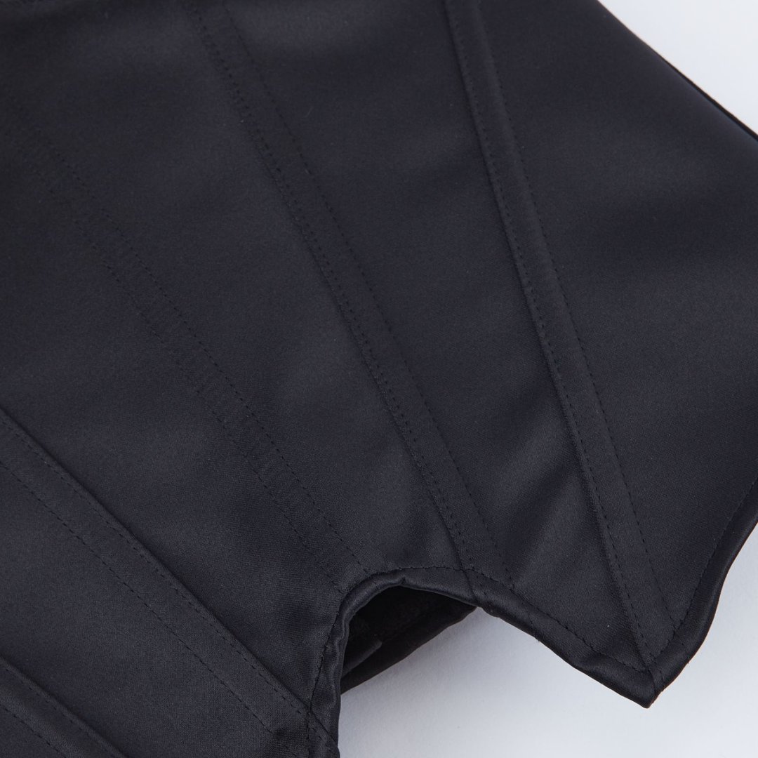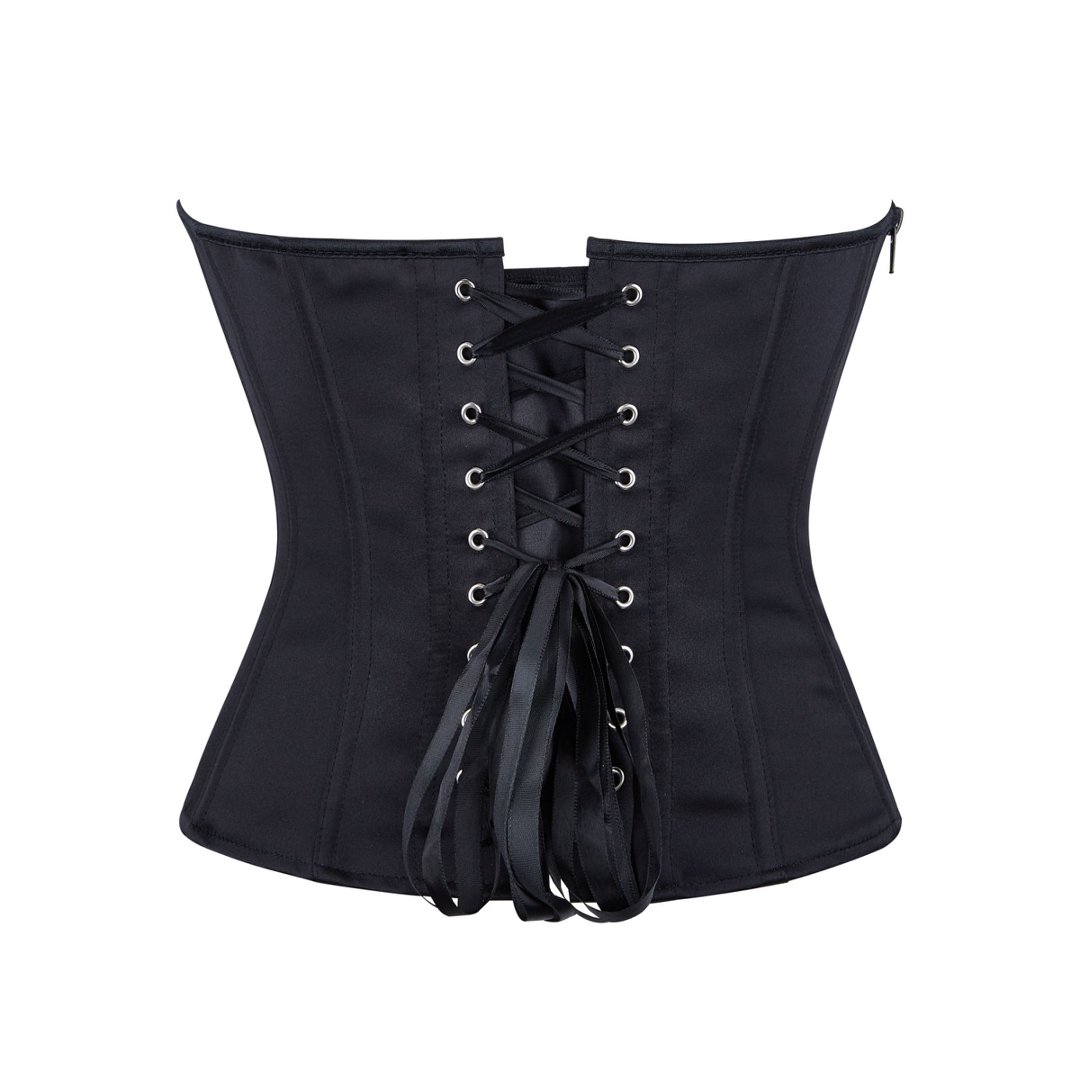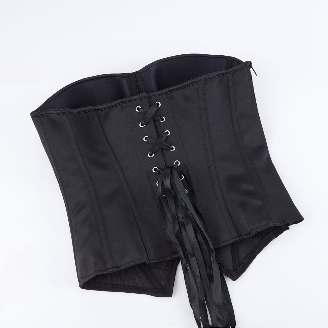Crafted in smooth black fabric, this strapless corset shapes and smooths your silhouette. The sweetheart neckline and vertical seaming enhance your curves, while the front lace-up closure with satin ribbon and silver eyelets allows adjustable cinching. With a side zipper for easy wear, it provides comfortable support and shaping—ideal for layering or as a standout piece for evenings and special occasions.