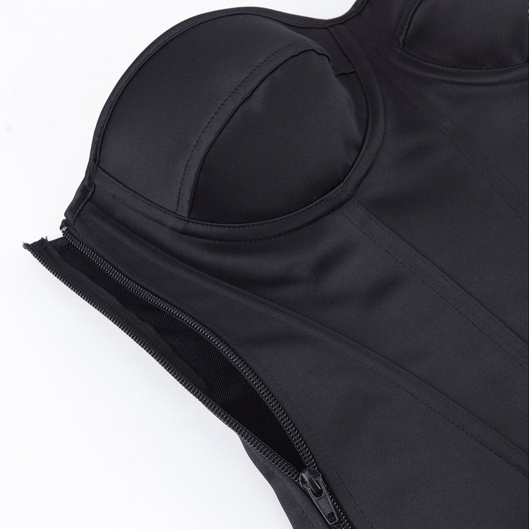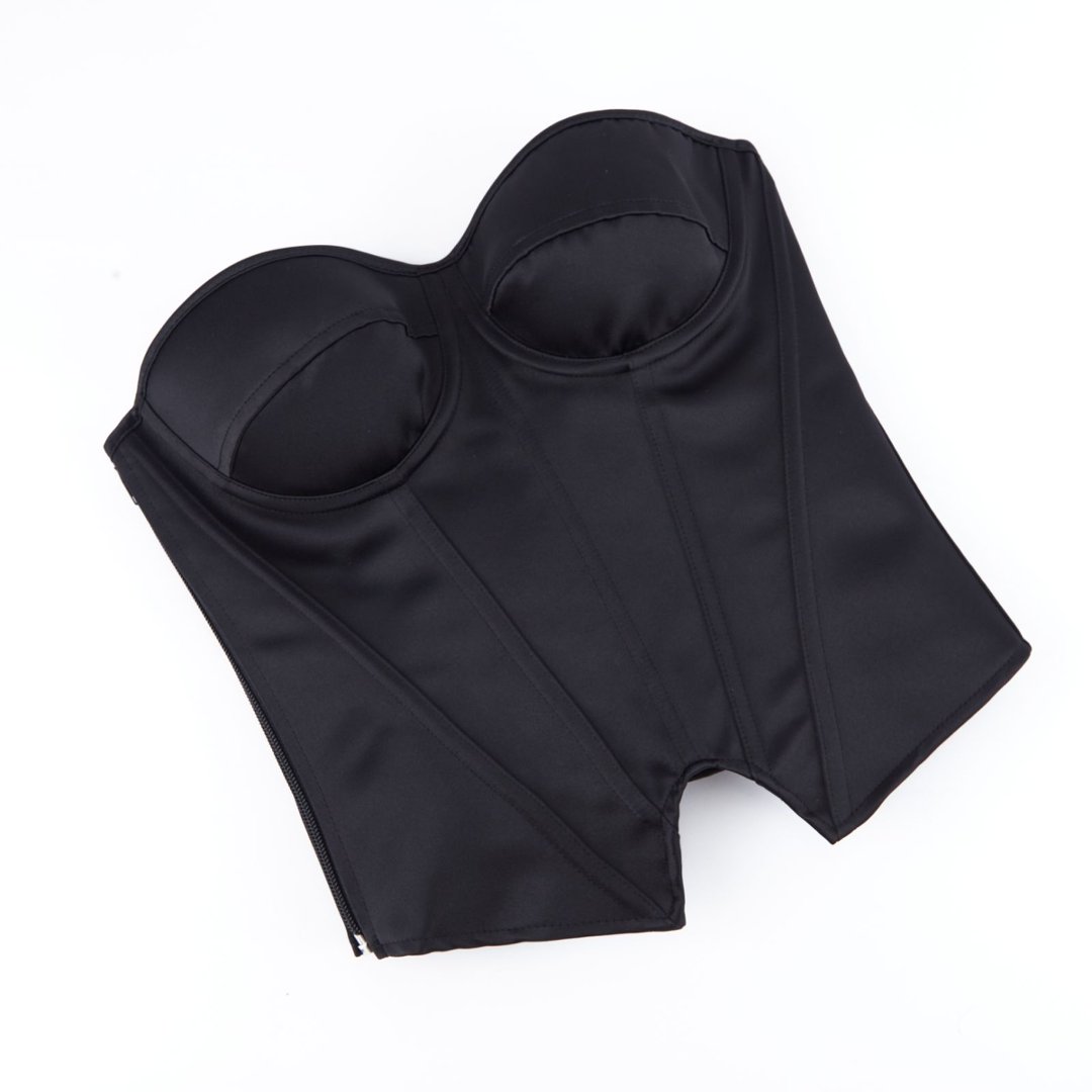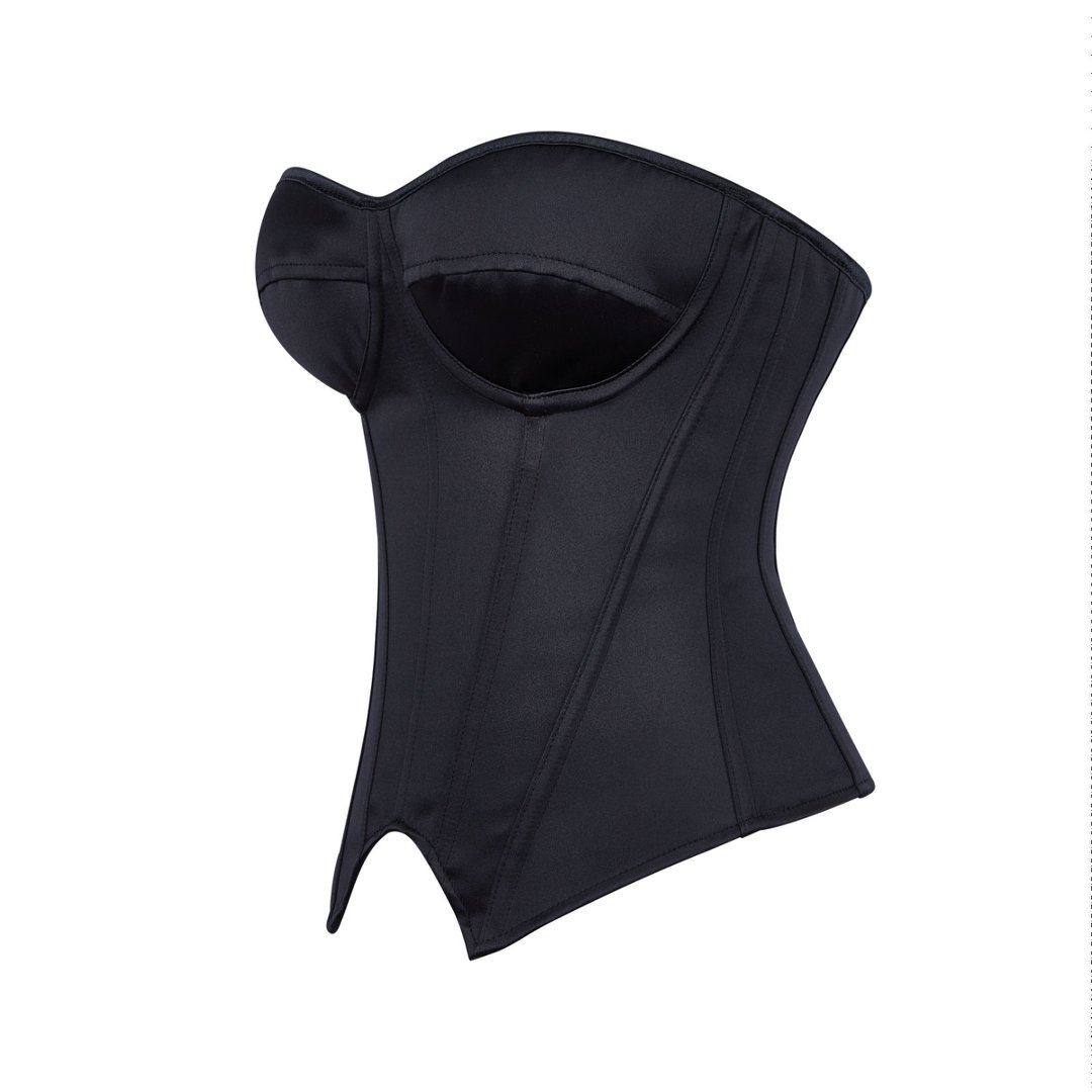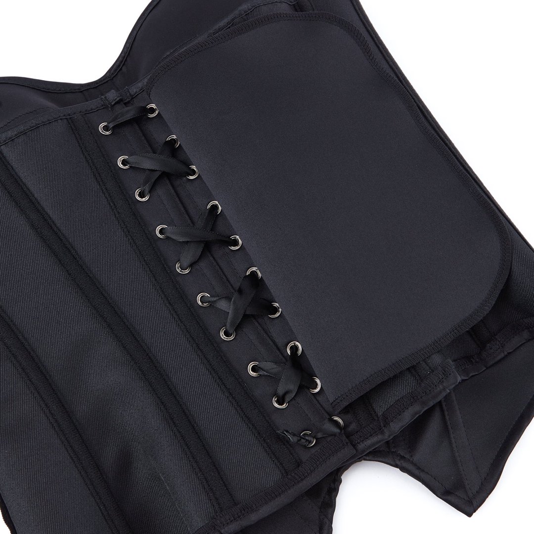 Crafted in smooth black fabric, this strapless corset shapes and smooths your silhouette. The sweetheart neckline and vertical seaming enhance your curves, while the front lace-up closure with satin ribbon and silver eyelets allows adjustable cinching. With a side zipper for easy wear, it provides comfortable support and shaping—ideal for layering or as a standout piece for evenings and special occasions.