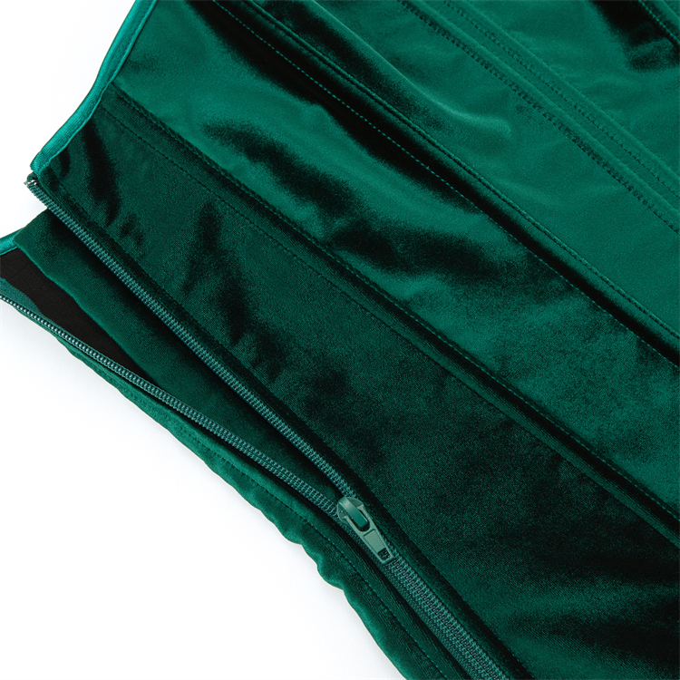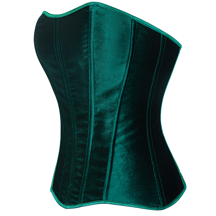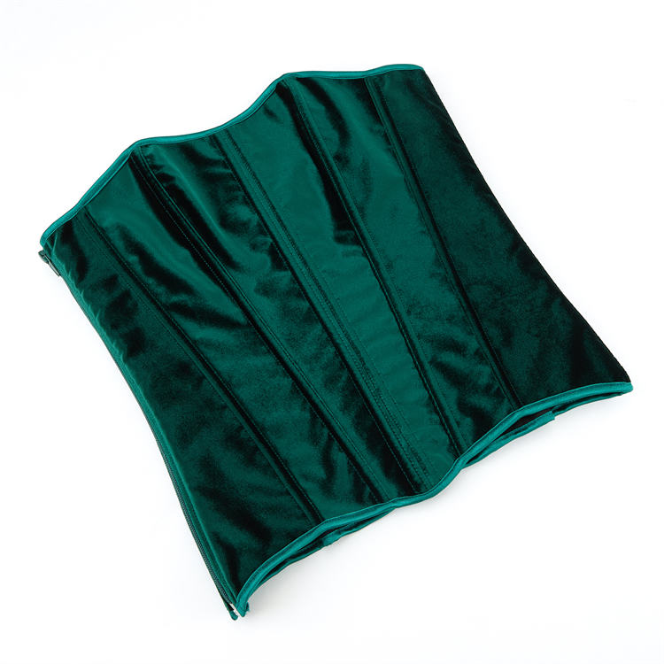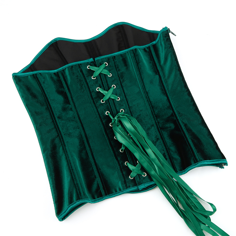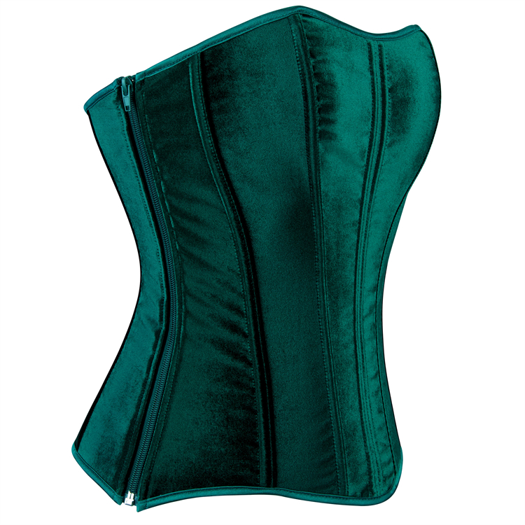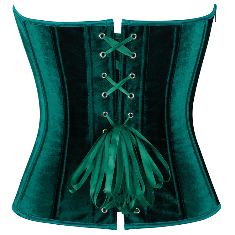 Embrace timeless elegance in this forest green velvet corset, made from smooth, luxe velvet for a vintage-inspired look. The front features a vertical zipper and decorative lace-up detail with a satin bow for adjustable shaping. Designed with strategic seaming and a strapless silhouette, it smooths and sculpts your waist for a defined, hourglass figure. Perfect for layering or as a standout piece for special occasions.
