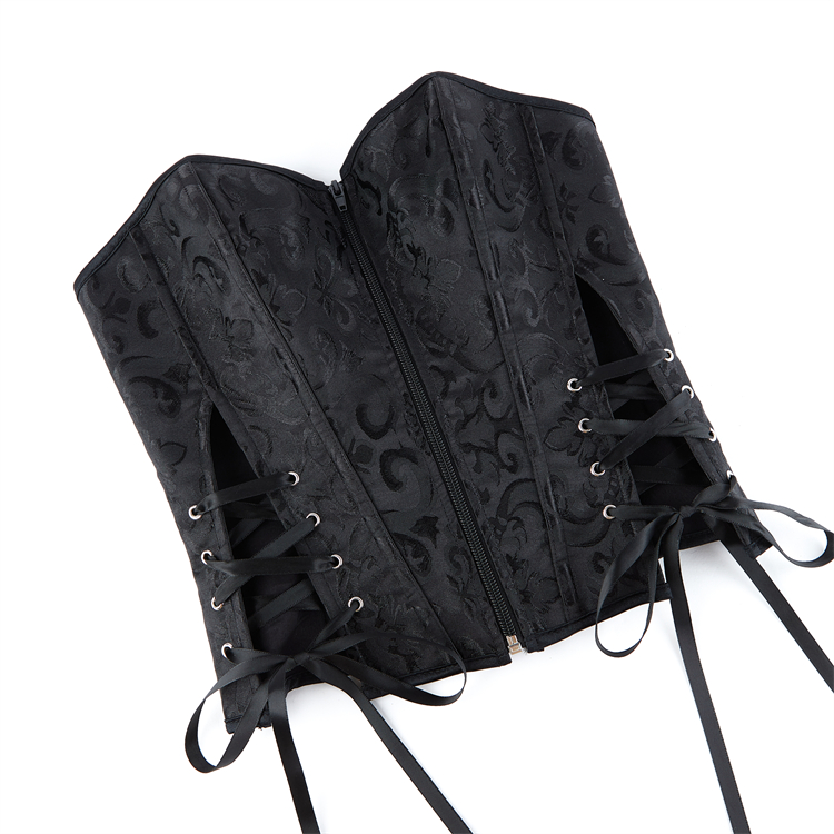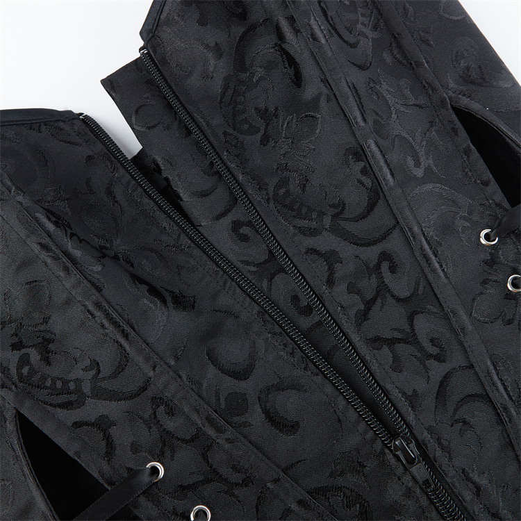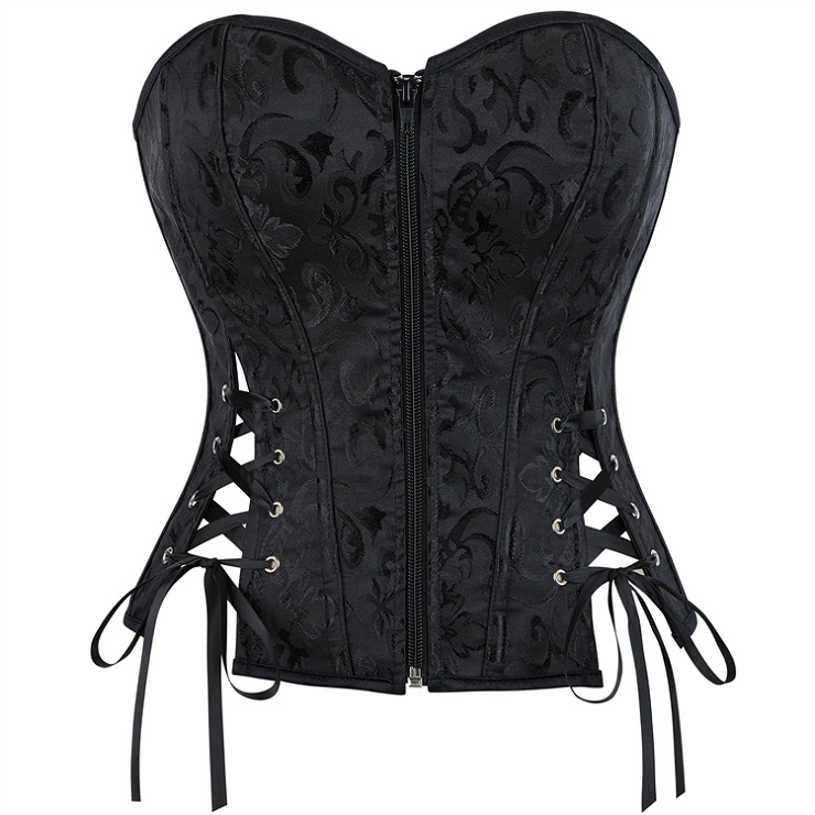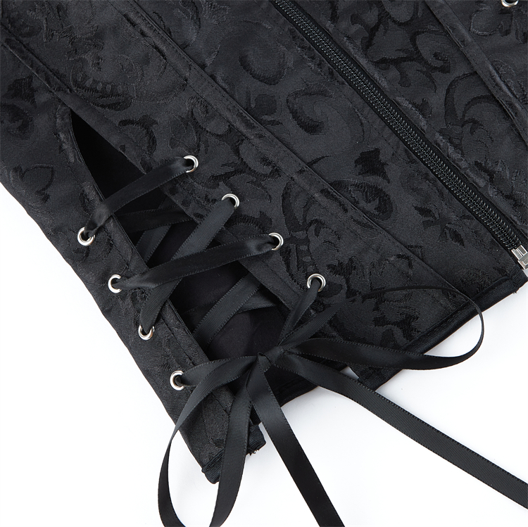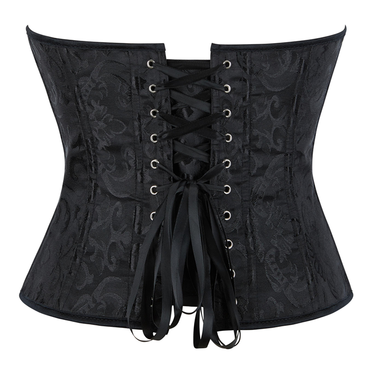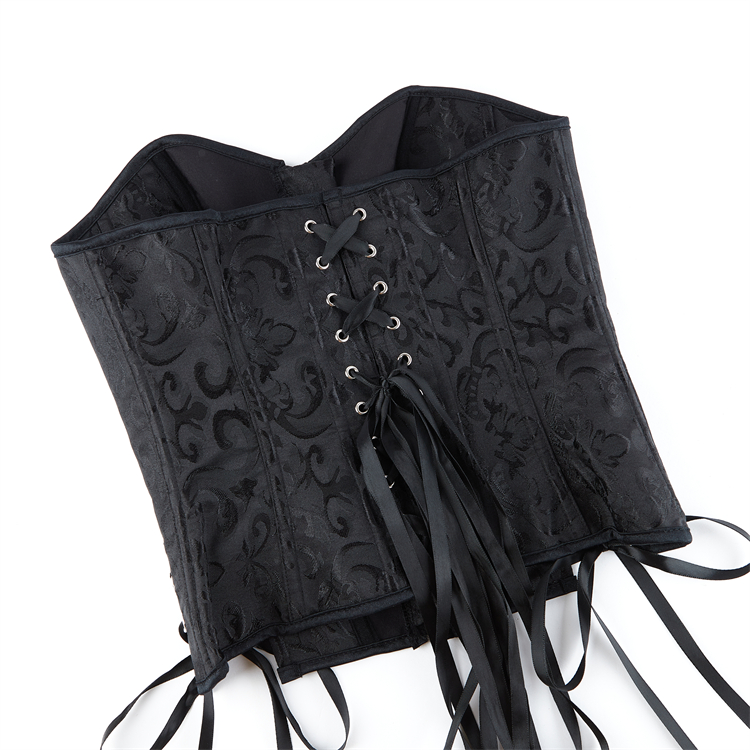 Crafted from smooth black jacquard fabric, this bustier combines vintage elegance with figure-sculpting design. The detailed front lace-up closure, threaded through metal O-rings and finished with a satin bow, allows for adjustable cinching to flatter your waist. Its strapless, structured silhouette smoothly shapes and supports, perfect for layering or as a standout piece for special occasions.