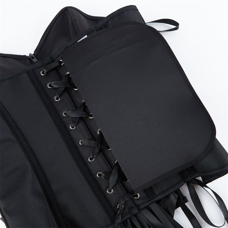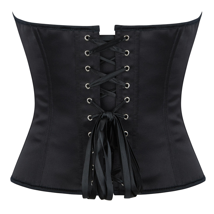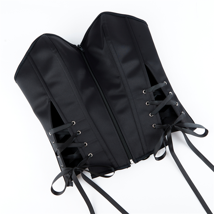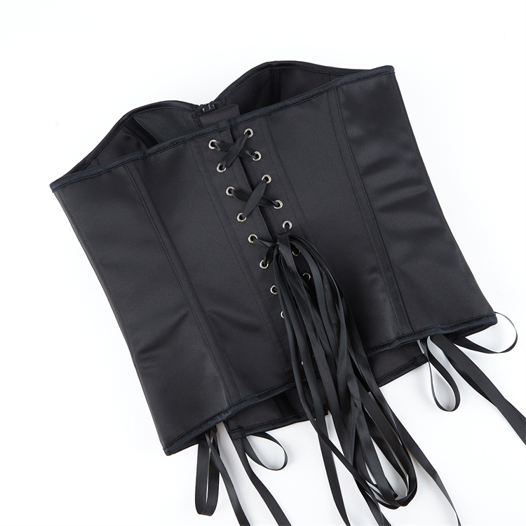 This sleek black satin bustier is designed to sculpt and smooth your silhouette. The front metal zipper ensures easy wear, while the adjustable side lace-up details let you customize the fit for a perfect waist-cinching effect. Made from smooth, supportive fabric, it shapes and defines your curves effortlessly. Ideal for layering or as a standout piece for special occasions.