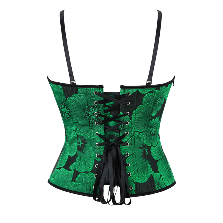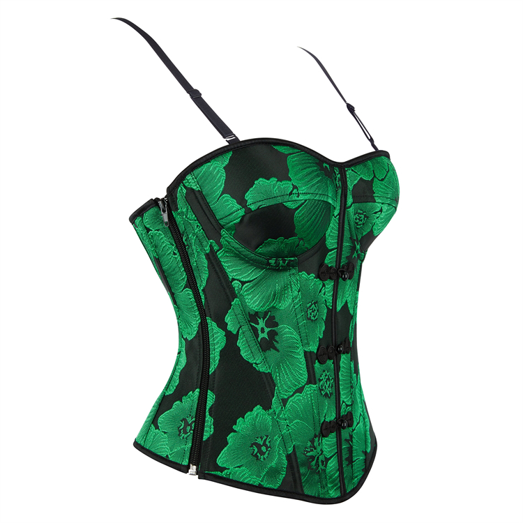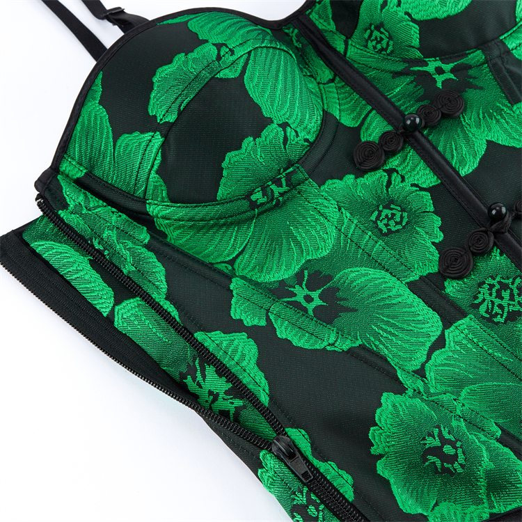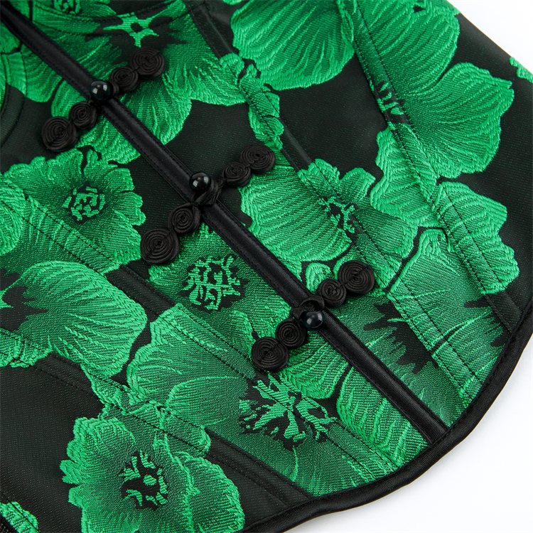 This green floral bustier blends vintage style with Eastern details. The textured 3D floral print and traditional Chinese frog buttons offer a unique look. It shapes your figure with an adjustable back lace-up and smooth fabric, perfect for layering or as a standout piece.