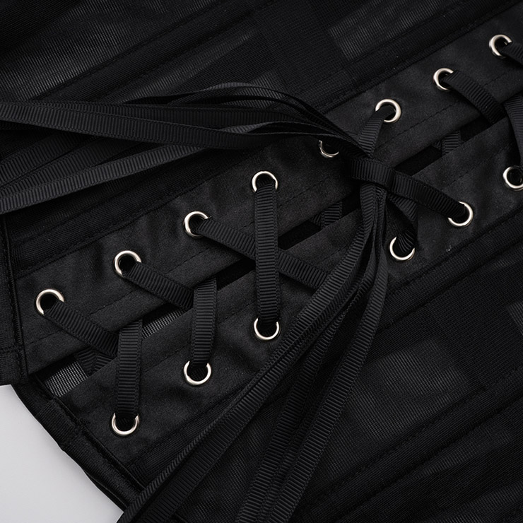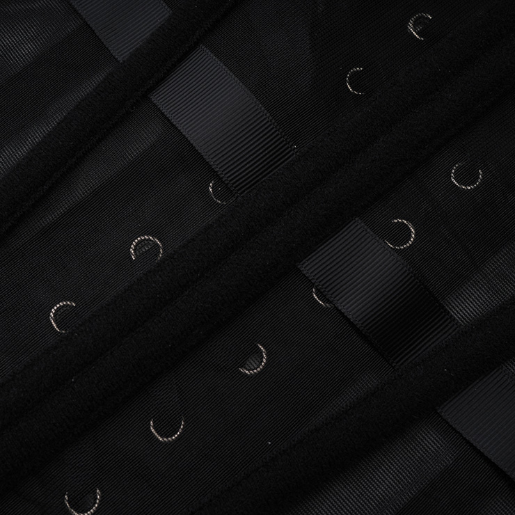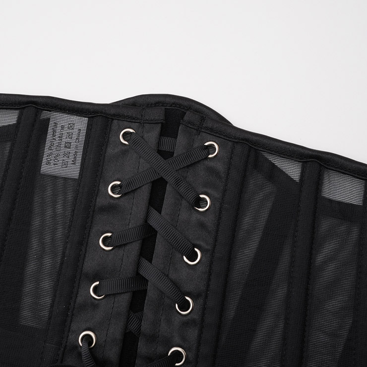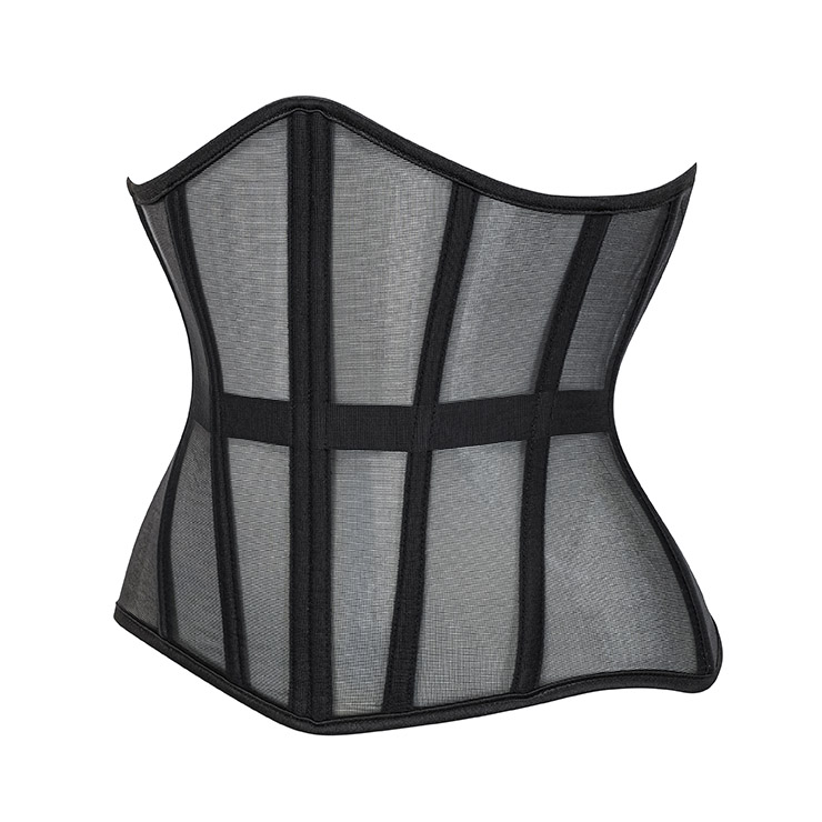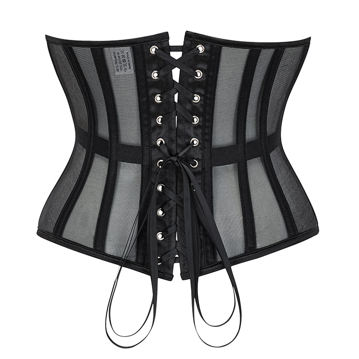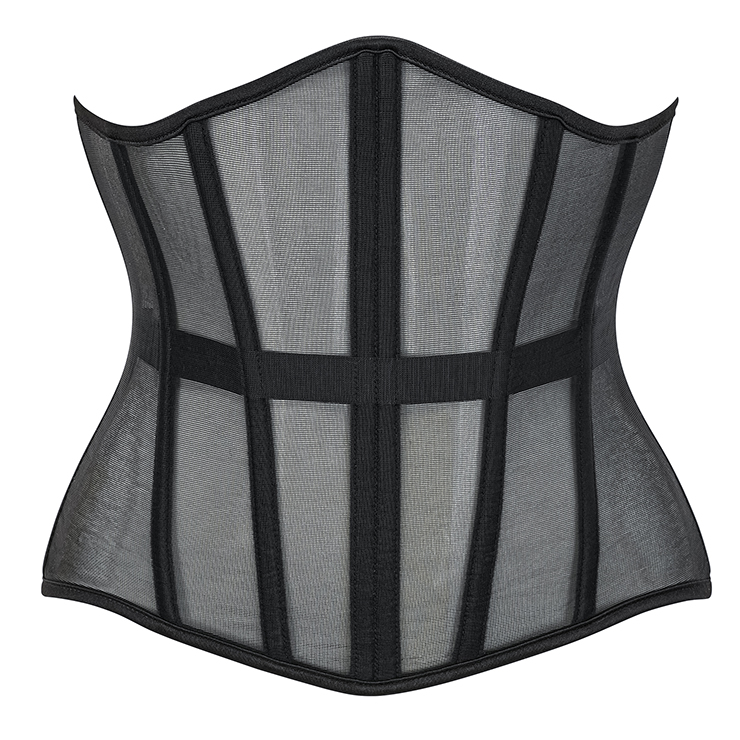 Breathable black mesh waist training corset waspie, includes 16 steel bones such as 2 Stainless Steel Busk Closure, 4 Flat Steel bones, 10 Spiral Steel Bones. Mesh fabric more breathable than others, It is usefui for waist tape reinforcement. G-string not included.