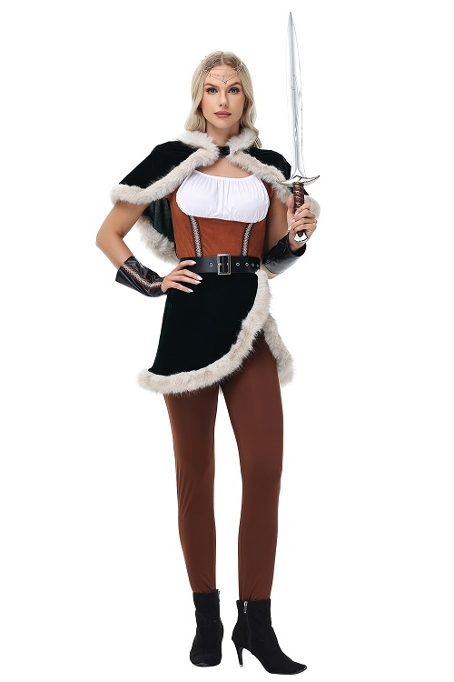 This complete 6-piece Christmas costume set includes a ??deep green velvet cape with luxurious white fur trim??, a matching ??short-sleeve top with fur accents??, form-fitting ??brown trousers??, a pair of ??detailed armlets??, and an ??adjustable waist belt??. The rich color palette of emerald green, brown, and white embodies classic festive spirit, while the premium materials ensure comfort and elegance. Perfect for ??Christmas parties, holiday photoshoots, or fantasy cosplay events??, this set offers a full immersive experience without the sword
