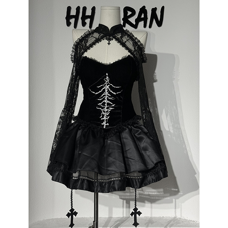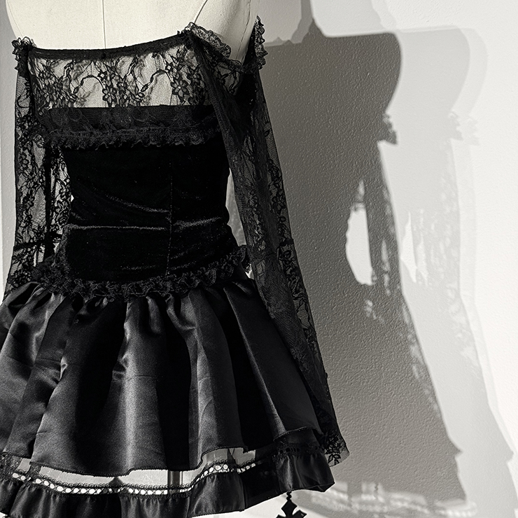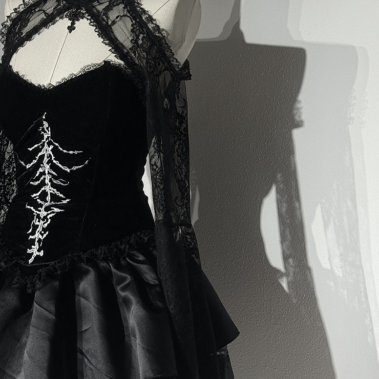 This gothic-inspired costume set includes a black bustier top featuring intricate silver embroidery and a detachable lace shoulder cape with dramatic bell sleeves. The matching black skirt is layered with ruffles for added volume and movement. Designed to create a bold and elegant silhouette, the set is perfect for themed parties, Halloween, cosplay events, or gothic fashion wear