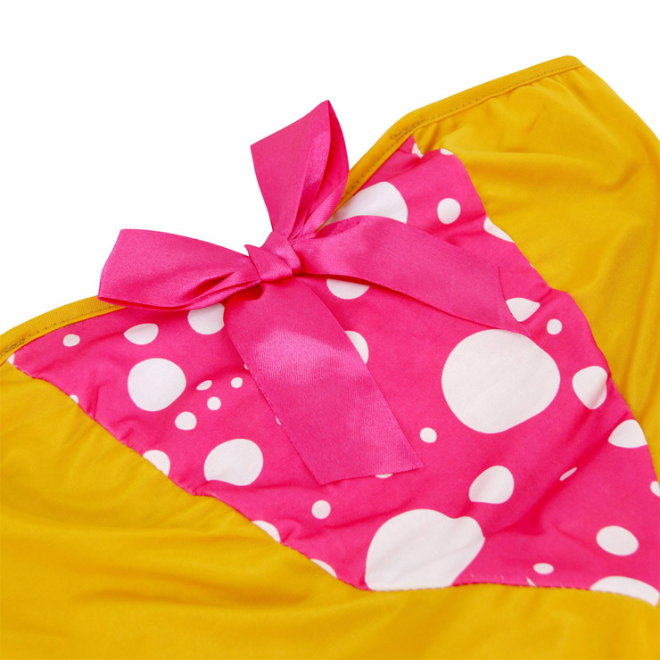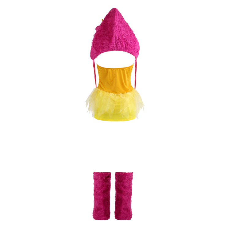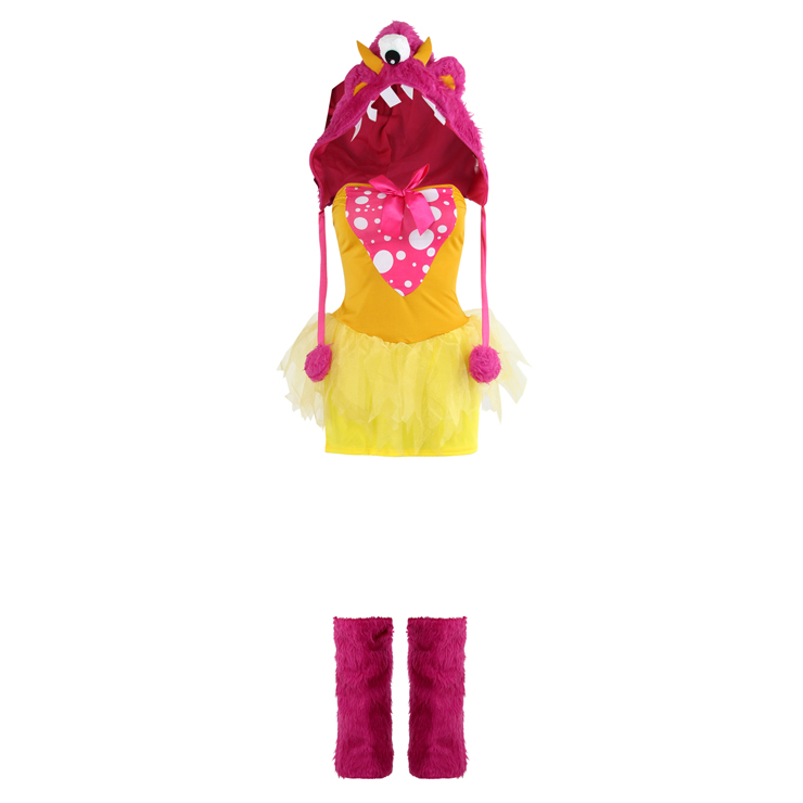 The Exclusive Tutu Tootsie Monster costume includes a mini, orange and pink tutu dress with polka dot print bodice and matching, pink faux fur, google-eyed monster hood with rainbow horns and attached pom pom ties. "Shake me out to make me shaggy!" To create the "shaggy" look, simply shake the costume out to add extra fluff and Leg warmers.